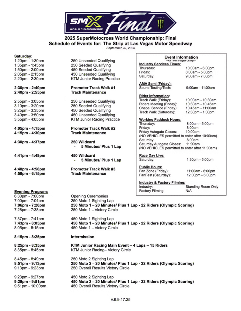 Fridayโs schedule will feature two free practice sessions for both the 250SMX and 450SMX Classes, giving riders a final chance to dial in their setups before the championship-deciding motos.