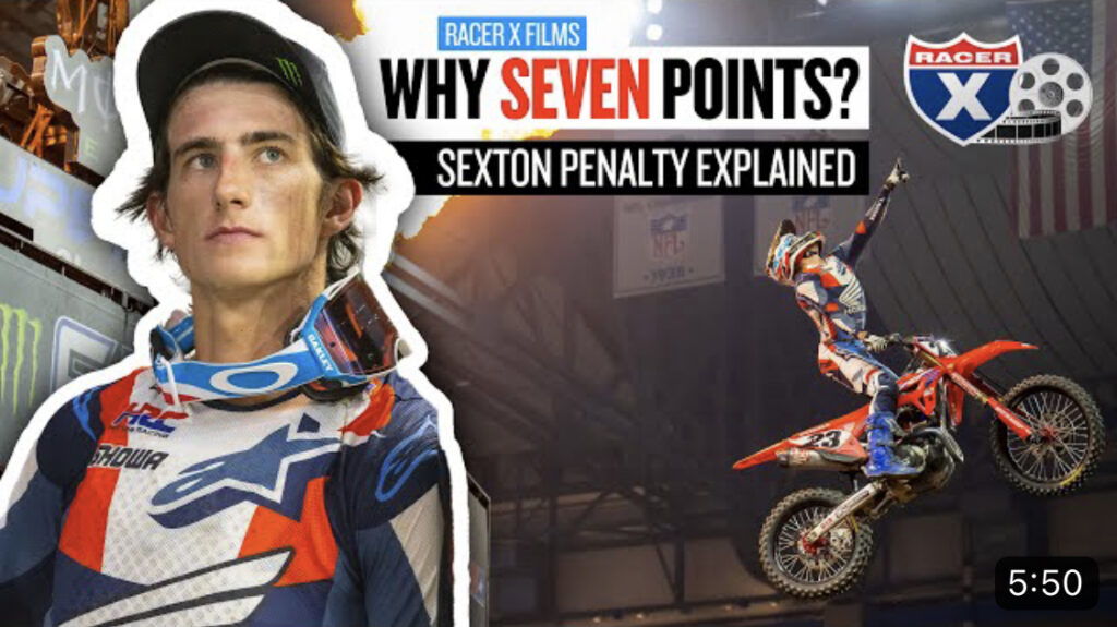 Honda HRC’s Chase Sexton was penalized seven points after winning the 2023 Detroit Supercross on Saturday night for jumping on a red cross flag halfway through the main event. To some, there was a lot of confusion about why Sexton ended up receiving a seven point penalty specifically so let’s break it down to why that is the penalty and where this rule even comes from.