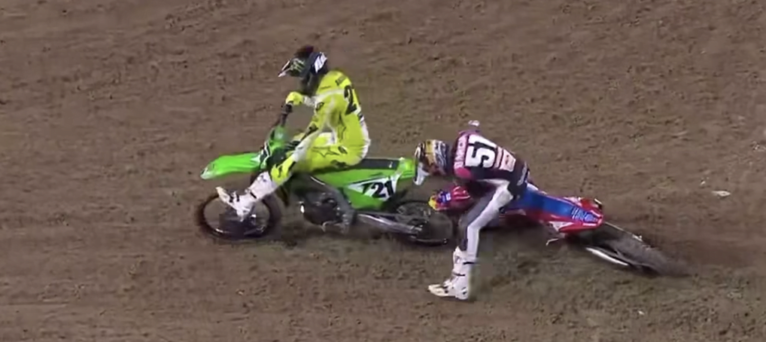 Things got heated in the 450 class, as Monster Energy Kawasaki’s Jason Anderson makes an aggressive move on TLD/Red Bull GasGas’ Justin Barcia. The move ends with Barcia stumbling to the ground and there were some words exchanged after the finish. Watch the replay below plus see Anderson’s comment on the incident via Twitter.