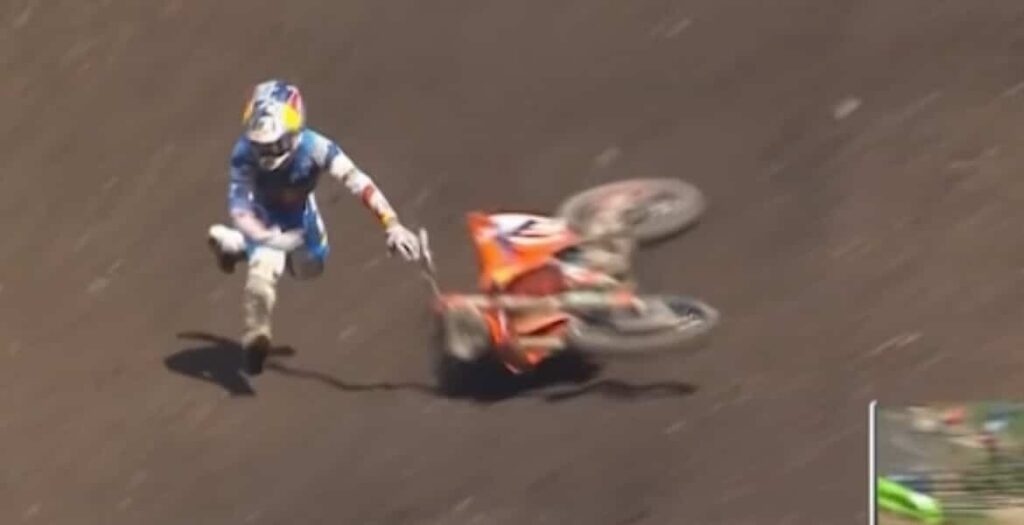 Chase Sexton had a strange crash in the 450 Moto 1 at the Ironman National after chasing the overall win and passing Hunter Lawrence. His front wheel locked up just before takeoff on a jump, causing him to land very hard.