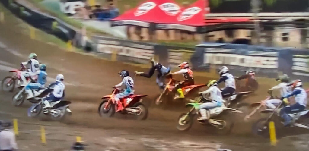 Nasty first turn pile up at 250 Moto 2 at Spring Creek National, Millvile.. Points leader Haiden Deegan and second plance Chance Hymas went both down..