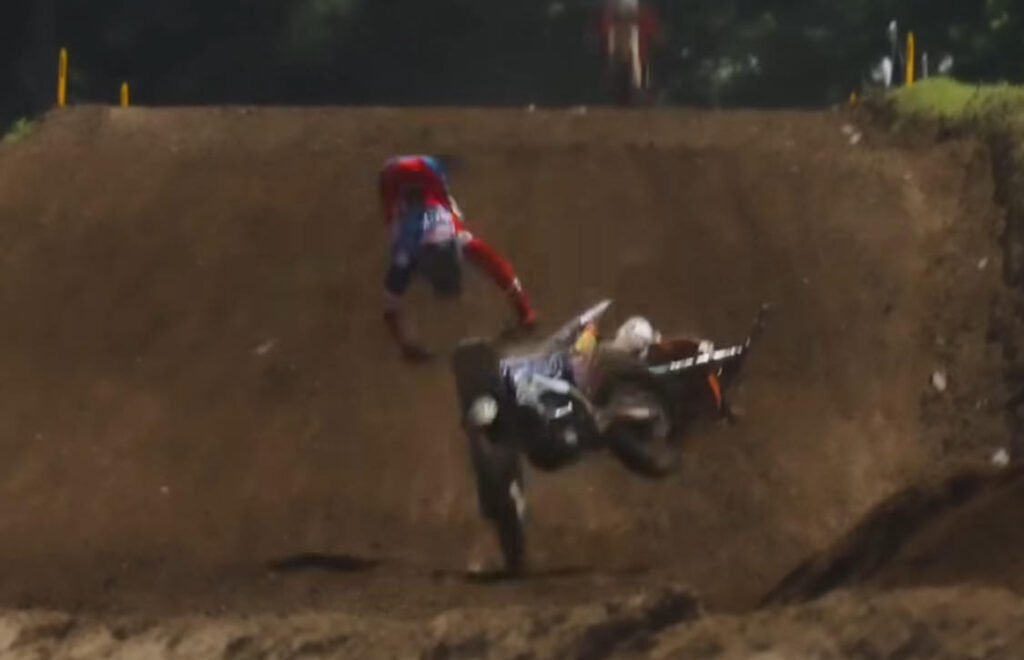 Star Racing Yamaha Haiden Deegan was making his usual strong push, running in sixth place, with Vialle and Masterpool within reach. However, he collided with a crashed backmarker’s bike and was thrown off his own machine!