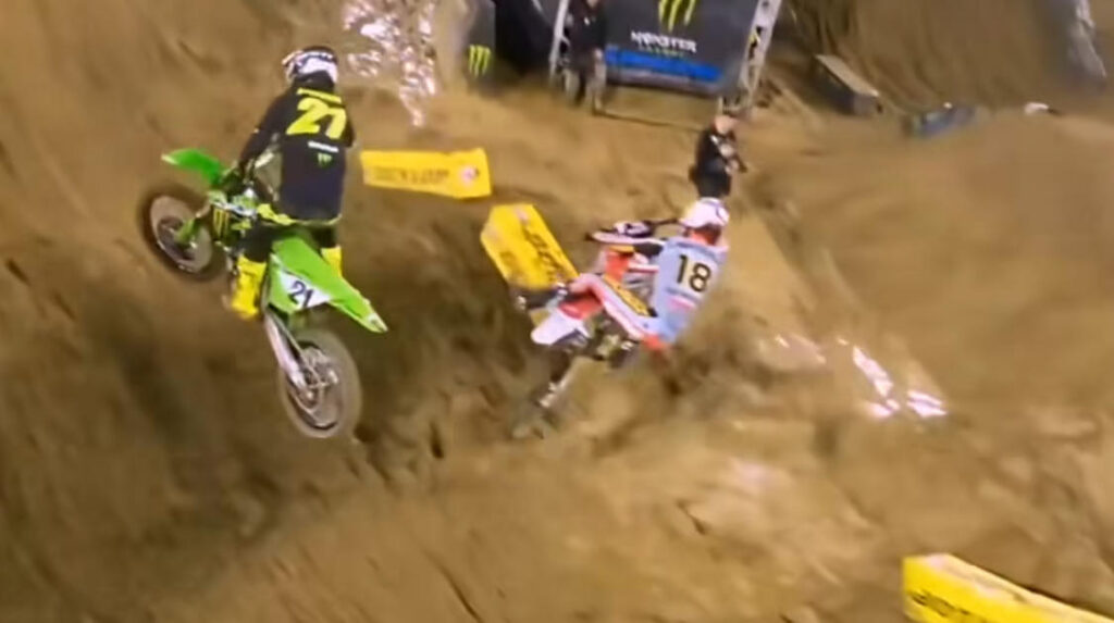 In case you weren’t in San Diego to see the action between Jason Anderson and Jett Lawrence battling for 4️⃣th at San Diego Supercross last weekend, @buddsskycam captured all the action via FPV drone