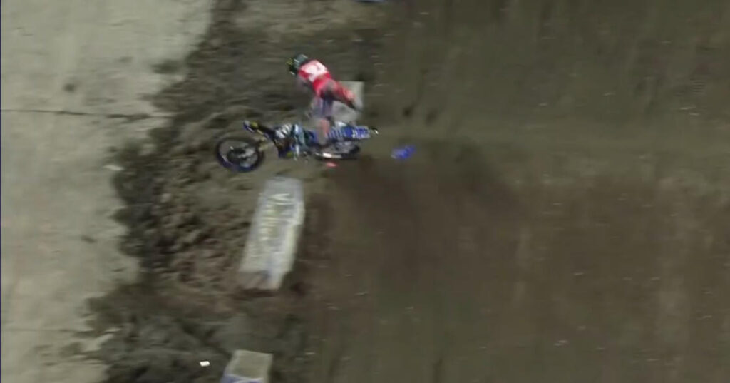 Monster Energy Star Racing Yamaha’s Justin Cooper had a scary crash during the first heat race at Foxborough Supercross. He was running second behind Tomac and was lucky to escape injury from this