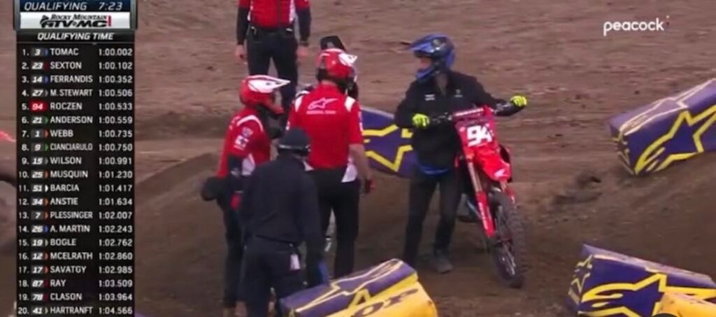 Ken Roczen had a hard crash in Q2 at the whoops section Oakland Supercross, Chase Sexton who was behind him, almost hit Roczen in the helmet with the front wheel..both riders had luck on this one, could have been worse Please follow and like us: