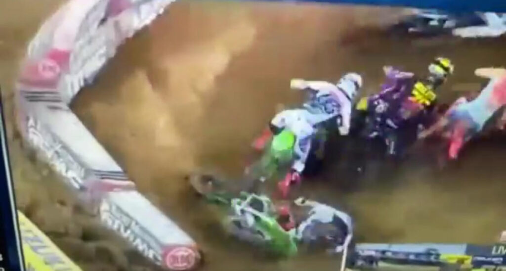 Monster Energy Pro Circuit Kawasaki 250 SX East and 250 SX West point leaders, riders Cameron McAdoo and Levi Kitchen, collided in the first lap of the 250SX Main Event at Nashville Supercross