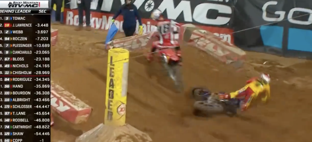 Monster Energy Star Racing Yamaha Cooper Webb didn’t seem too happy with Hoinda HRC Jett Lawrence’s pass on him and tried to exact some retribution but ended up going down himself as Jett stayed up after the hit – as Tomac won the heat!