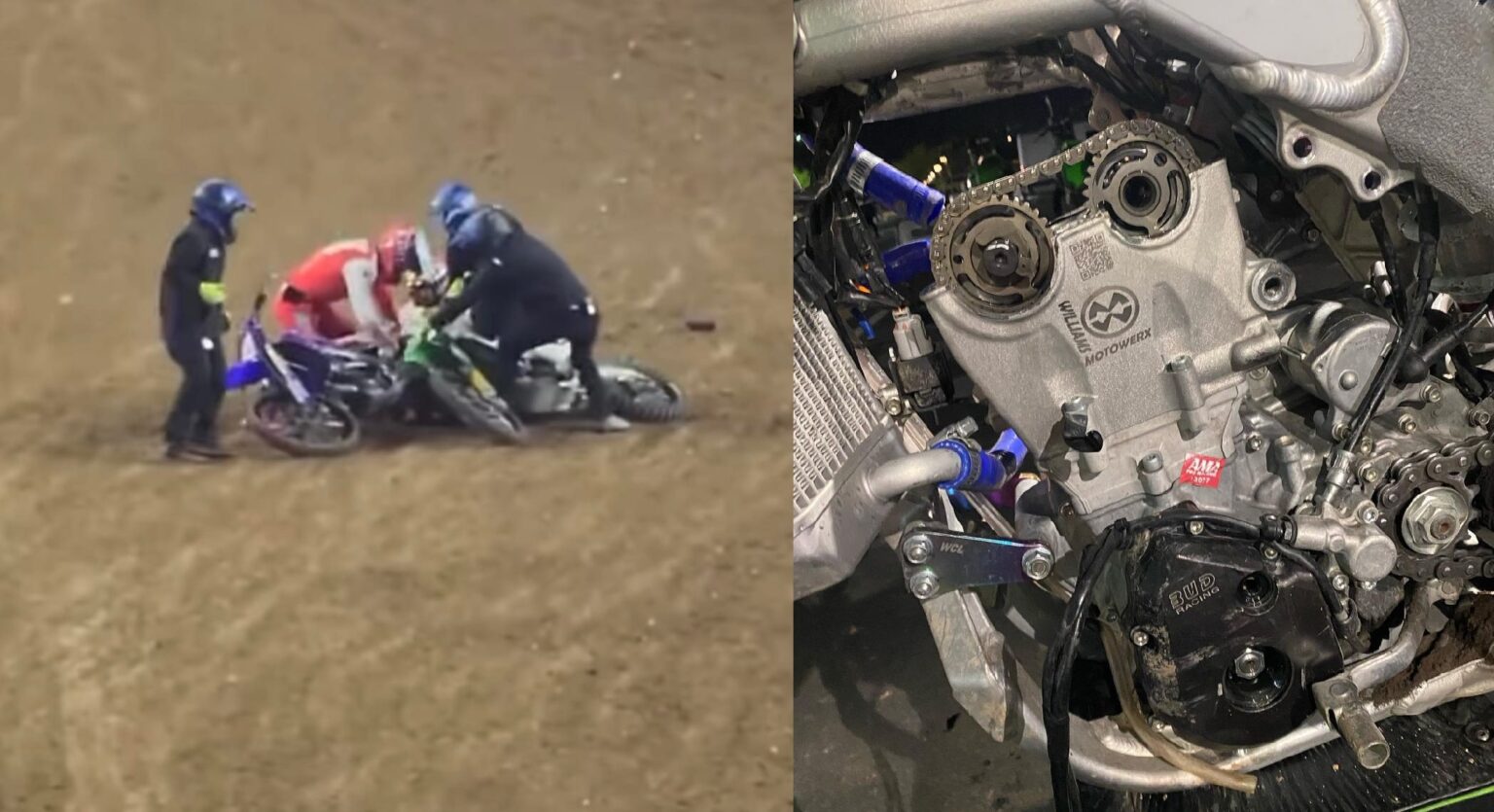 Hunter Yoder posted on social media – Unfortunately got the short end of the stick all night long. Broke my clutch off first lap of the first main, bars fell down to the tank about 5 minutes into the second main, and got absolutely obliterated the last main 😭😭 Ended up getting torn down after the main which was pretty sick as well 😂speed is there so now it’s time to go finish where I belong. Thanks to team for giving me a great platform to do what I love ..
